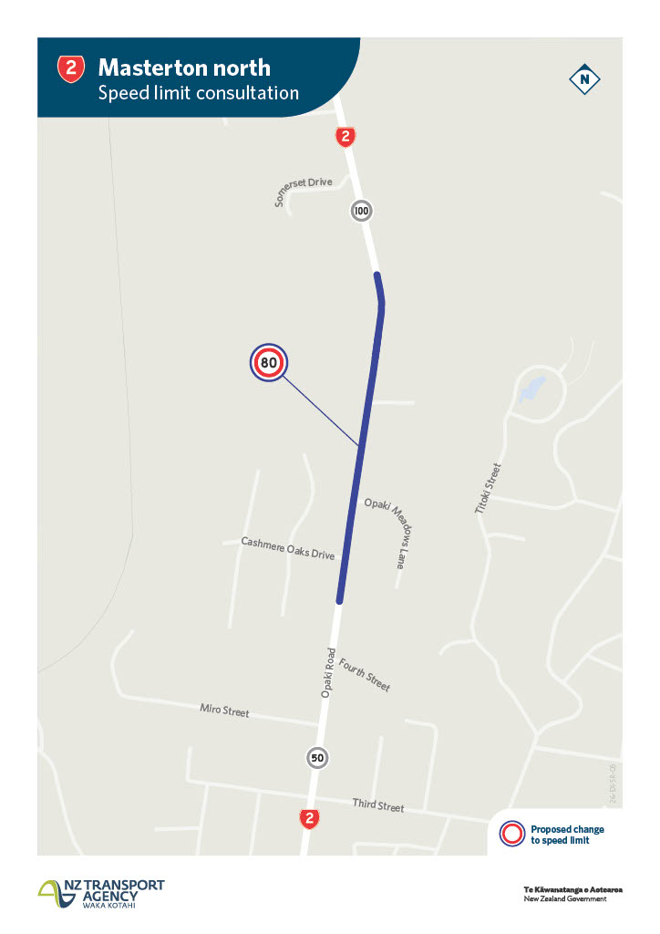 - SH2 Masterton north – 100km/h to 80km/h, from Opaki Road from Fourth Street northwards to south of Somerset Drive.