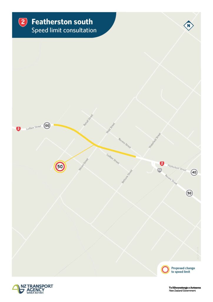 - SH2 Featherston south – reduced from 70km/h to 50km/h from south-west of Wakefield Street to west of Renall Street.