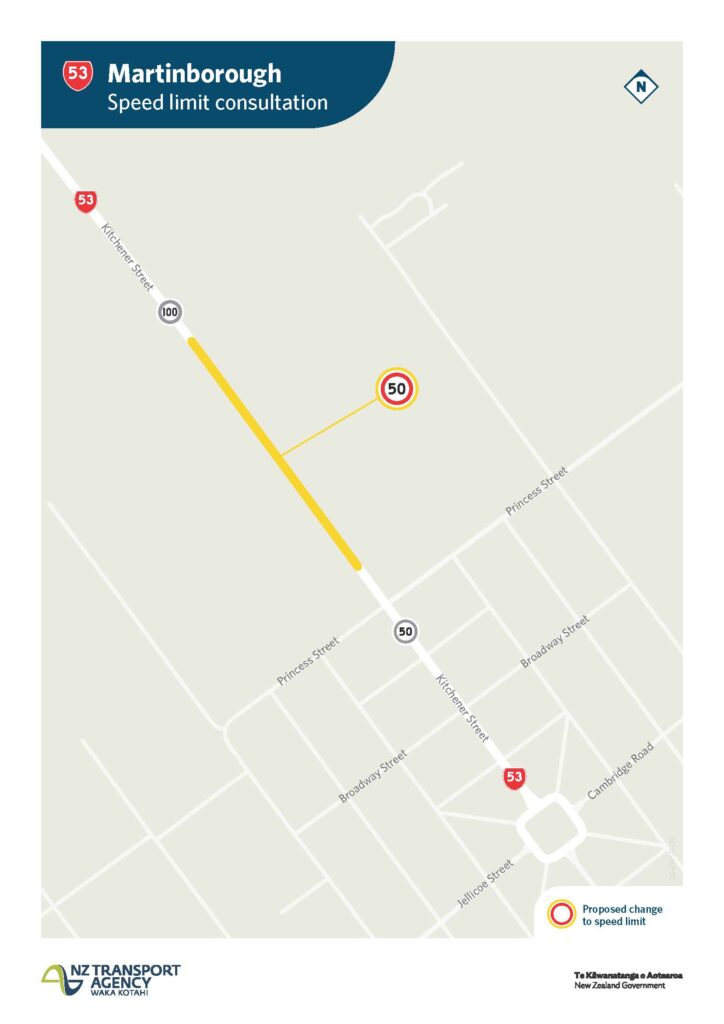 - SH53 Martinborough – reduced from 70km/h to 50km/h, from west of Palliser Estate Tasting Rooms on Kitchener Street approach to Martinborough (existing 100/70km/h change point), to north of Princess Street.