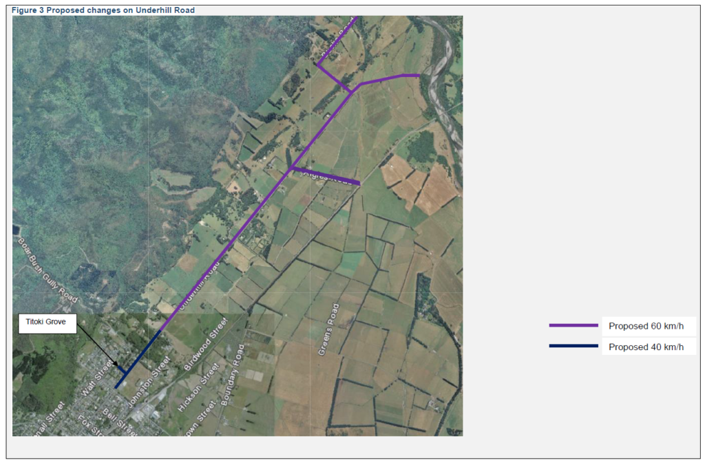 | Underhill Road between existing 50/100 speed limit change and end of road | 100 | 60 |