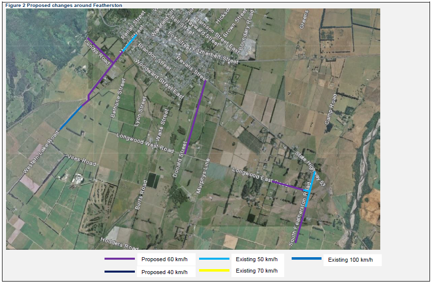 | Longwood East Road between 550m west of South Featherston Road and 50m west of South Featherston Road (at the existing 100/50 km/h speed limit change) | 100 | 60 |